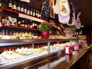 Moving on swiftly we went back towards the town where we had a good walk round and found Graham’s lunch recommendation – we’ve never seen such a choice of tapas! Slices of barra (baguette) topped with slabs of meat, seafood, cheese – all beautifully presented and mainly topped with fresh anchovies, or so it seemed. The idea is that you take a plate, help yourself to the tapas and then you are charged by the number of cocktail sticks on your plate. We had a very filling lunch, 2 glasses of wine and a beer all for 16 euros – great!