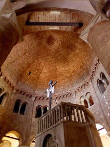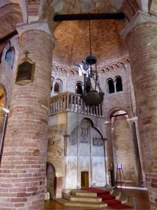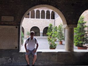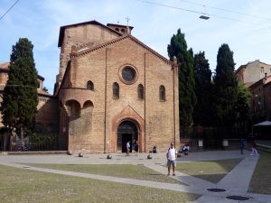 We started Tour Day II with the student area where the old theatre’s located, and then moved onto the Piazza Santo Stefano and into the ancient church complex which dates back in part to 393 A.D. Pretonius transformed the Roman temple into a Christian church around 450 A.D. It was then extended in the 8th century, and again in the 11th and 12th centuries.  This was Karol’s favourite building in Bologna.