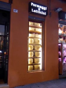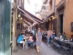 By this time it was early evening so we wandered around the Quadrilatero which is a series of narrow streets lined with mainly food shops and cafes and restaurants, adjacent to the Piazzo Maggiore.  We stopped for a quick glass of wine at a food court, and then chose our restaurant for dinner. There was a great atmosphere, with loads of people about; really vibrant.  Fishmongers, greengrocers, and delicatessens which doubled as restaurants were all in evidence, and it was at one of these that we chose to eat.