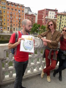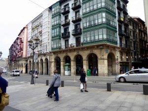 Still, we were in Bilbao in plenty of time, parked in an underground car park near the railway station and set off, using Google Maps to find the Tourist Information office. After collecting a map we stopped for coffee and Portuguese custard tarts and then headed to the tour rendezvous with our guide David. He’s not from Bilbao but Granada, but was nevertheless very knowledgeable and we had a fascinating two hours whilst he showed us round the very small old town which consisted of just seven streets at right angles to the river.