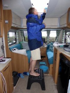 I’d also promised to barbecue a couple of pork steaks so set to under the canopy whilst Karol prepared salad. All of a sudden water started to pour through the roof light into the caravan lounge. We quickly placed a couple of washing up bowls down to catch the water and then attempted to look for the cause. There’s been a puddle on the caravan roof for a while now (apparently quite normal) and on closer inspection it looked like one of the catches on the roof light hadn’t been fastened properly, so hopefully this was a one off and wouldn’t reoccur. It still took us 45 minutes to resolve and mop up though, and we were both quite despondent. What else can go wrong? No water in the right places and too much in the wrong! And it’s still raining……..