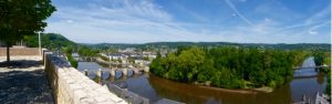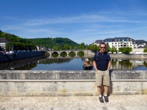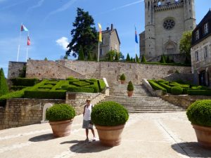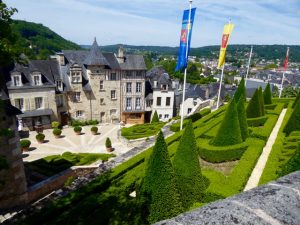 On Thursday we picked the hottest day of the trip so far to explore the area north and east of the site. We first visited Terrasson, about a 30 minutes drive away, as my Mum and Dad had waxed lyrical about how beautiful it was in their 1988 holiday diary, and Thursday was market day so it seemed a good day to go. The market was in full swing when we got there, and was certainly bigger and more varied than Les Eyzies. We had a lovely browse amongst the food stalls, and then crossed the river by the old footbridge to the non food market on the other side. I broke my three euro rule by buying extra pants at five euros – there’s inflation for you.