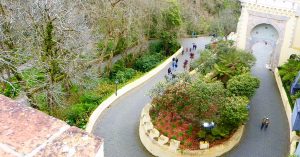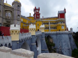 We decided on a change of scenery on Thursday with a trip to Sintra where there are 7 palaces. Perhaps not my best choice of a day out as the navigation proved to be quite tricky, both in the car and on foot. Having reached Sintra it was so busy we couldn’t find a parking space, and ended up on a very narrow two way road, also used by tour buses, van drivers and mad Portuguese motorists – Grant was not happy at all! We eventually found our way out and stopped for lunch and coffee in the next small town, then decided we couldn’t drive all the way to Lisbon without trying to see the Sintra sights so braved the journey back. This time we parked on the edge of the town and walked in – we were stopped by the enthusiastic Bernardo who drives a Tuktuk, and he gave us a very hairy 10 minute ride up the mountain whilst giving us lots of tips on which palaces to visit, where to see the best sunset, which shortcuts to take, all while turning round to face us! He took us to the Palacio de Pena which is like a Disney castle as you’ll see in the photos.