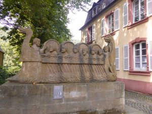 We drove to the Mosel valley the next day as Sixe had mentioned how beautiful it is, and we plan to move the caravan there at the weekend for a few days. This is an important area for wine production, and the steep slopes on either side of the river are planted intensively with vines, right down to the roadside in most cases. Our first stop was Trittenheim, a small town right on the bank of the river with fabulous views all round. We stopped to watch a barge transporting coal down the river, then walked round the town looking for a cafe – unfortunately nowhere seemed to be open, so we moved to the next town, Neumagen, which was only 3km away. Neumagen (Noviomagus) is another town with Roman history, as it was home to a massive Roman fortification with 14 towers and 2 gates – again built for Constantine. There is still plenty of evidence of Roman times – we were especially taken with the Neumagen wine ship tomb. We had a quick lunch, more bratwurst for Grant, and a walk round the town before driving along the riverside to Bernkastel.