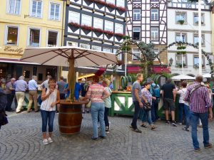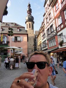 Each town on the Mosel has a wine festival in the summer months, so you can be pretty sure to come across one or more during your stay. As Cochem is the largest big town nearby, we expected great things. However, when we got there late afternoon we found it wasn’t in fact open yet. It eventually kicked off at five o’clock with three market square bars serving their own Mosel wines in souvenir glasses (which you had to buy of course, costing €1 each.) We sampled a couple of the wines, and were amused by the antics of a group of ladies of ‘a certain age’ – one in particular was obviously well away, shaking her stuff to the piped music in the square. A lone gentleman happened to be passing, and she decided to engage him in conversation; it was clear she was propositioning him! He seemed quite taken for a while, bantered with her and then walked on, so her efforts were all in vain. However I for one was giving her a wide berth as we had a walk round the remainder of the festival ‘area’ which took about 10 minutes, none of which was yet open.