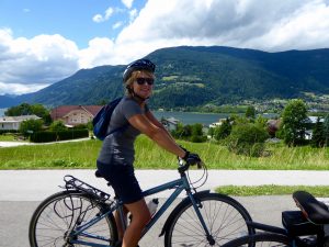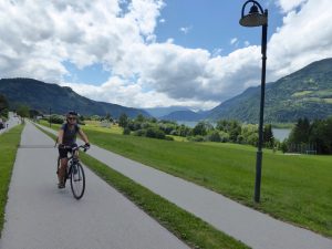 The weather continues to be a bit mixed, but at least it has cooled down now, and most of the time it’s in the early 20’s which is very pleasant.  On Thursday we decided to circumnavigate the lake on our bikes – just short of 30 km, and as such was Karol’s longest ever bike ride! It was relatively flat too, and all on cycle paths, so no motorised traffic to contend with.  We also had great views of the mountains and the lake itself.