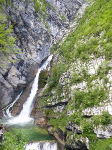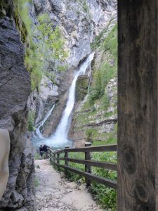 After our picnic, where we were accompanied by a flock of sparrows (very entertaining watching the parents feeding their young with our crumbs) we drove into the Triglavski National Park and up to Bohinj.  We decided to press onto the waterfalls first, where we followed the well laid out steps up the mountainside to the falls themselves.  We could write a guide book on waterfalls after this holiday!  This one was particularly long – 78 meters from top to bottom, in an A shape, with a point at the top and two torrents of water.