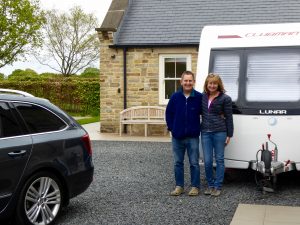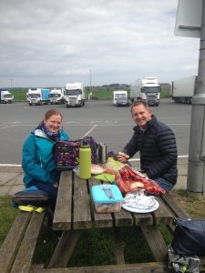 Our first stop was a late planned but lovely start to our trip – a fab picnic lunch with Debi at Woodall Services on the M1! The sun shone as we sat at a picnic table alongside the motorway, with our car and caravan dwarfed by the lorries alongside.