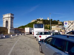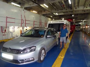 Of course we all got though in the end, and moved into yet another queue to board our ferry. We were put in with the lorries, so patiently waited our turn as each of these reversed onto the ferry as they had in Barcelona; unlike the ferries in the UK these only have one door, so are not ‘drive on, drive off’. However, unlike Barcelona, where there was room for us to do a U turn with the caravan on the car deck itself to end up facing the right way, this time they wanted us to reverse on.