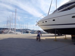 The weather was absolutely perfect – clear blue skies and temperature in the mid twenties, so we had an explore along the coastal path on our bikes cycling the 5 km to Trogir itself, via an amazing marina, before stopping at a beachside restaurant on the way back for a drink and some fish, which was excellent.  Everyone here is so friendly!