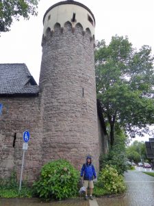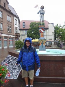 On Thursday it rained.  We’d been expecting it, and decided to press on regardless, put on our kagools and visit Ettlingen once more to follow the historic walking tour we’d collected from Tourist Information on our earlier visit. We spent an interesting couple of hours strolling around the centre in the rain, with a brief stop for coffee and cake (getting to be a habit!) to dry out.