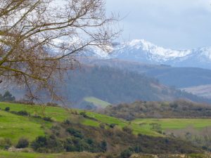 Caravaning Oyambre, San Vicente de la Barquera, Spain – great view of snow covered Picos mountains when we arrived fresh off the ferry