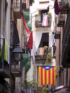 Purple, yellow and red. Underneath is the flag of the Catalan republican movement – not recognised by any government.