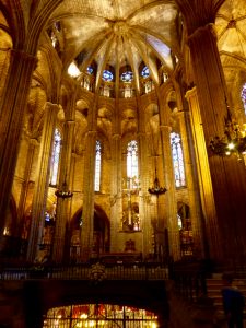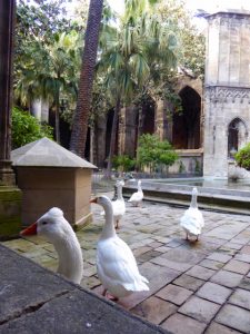 The cathedral is named after Santa Eulalia, a thirteen year old girl who was tortured in various ways in the 4th century by the Romans, in particular by being rolled 13 times down a hillside in a barrel which was pierced with sharp knives. Despite all these attempts with the barrel Eulalia wasn’t even scratched so they chopped her head off – that did it. The courtyard is the home of 13 white geese who live there in memory of Santa Eulalia, one for each year of her short life.